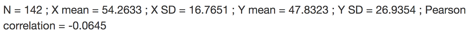 In case you want to use the Datasaurus in your classes or talks to illustrate how important it is to visualize data while analyzing it, feel free to download the data set from this Dropbox link.* It'll be fun to first show your audience just the figures and the summary statistics, and then ask them to make the chart: