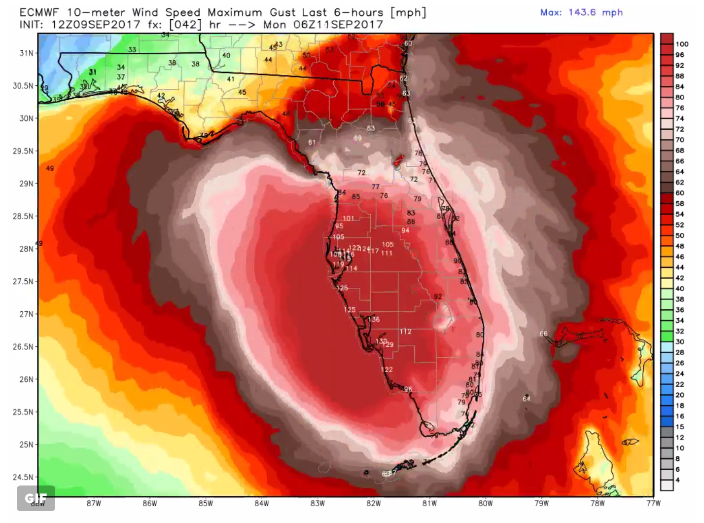 UPDATE 2: The map below, by meteorologist Ryan Maue, is far better than any cone of uncertainty map if your goal is to inform the general public about the risks posed by wind. See it animated. The scale is predicted maximum wind speed in mph.