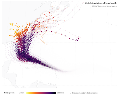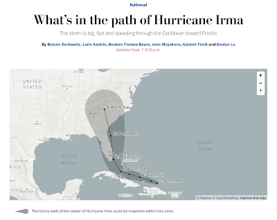 Data visualization isn't just about visualizing data, but also about writing headlines, intros, captions, explainers, and footnotes. I'm right now closely following the news about hurricane Irma —I live in Miami!— and feeling both amazed and terrified by the many great graphics news organizations and independent designers are publishing. As I've just tweeted, beauty is sometimes correlated with terror.